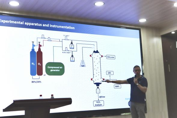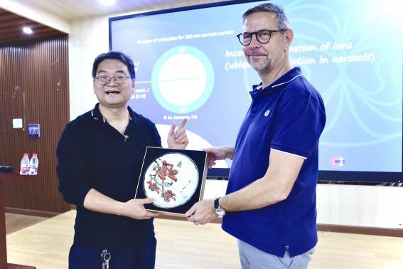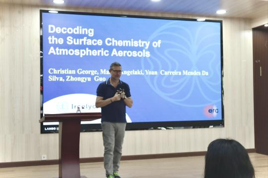 Christian George教授开场首先指出污染的全球性以及污染治理是全球难题,然后解读了大气气溶胶的表面化学特性及其研究意义。气溶胶与云层是对流层化学反应的核心参与者,是气候预测中最大的不确定因素之一。这些悬浮在空气中的微小颗粒,不仅影响大气成分,更是气候预测中最大的不确定因素之一。