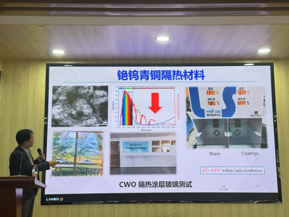 在工业节能领域,蒋教授分享了团队最新成果:成功开发系列新型智能节能玻璃材料,其中稀金纳米隔热玻璃及常温固化稀金纳米隔热刷涂涂料表现尤为突出。该材料性能优异,可经受多种极端环境考验,质保期长。目前,团队已形成从纳米粉体、分散液到涂料、玻璃、膜产品的全产业链布局,既能满足新建项目的节能需求,也能为既有建筑玻璃提供高效隔热改造方案,为工业绿色升级提供了切实可行的技术支撑。